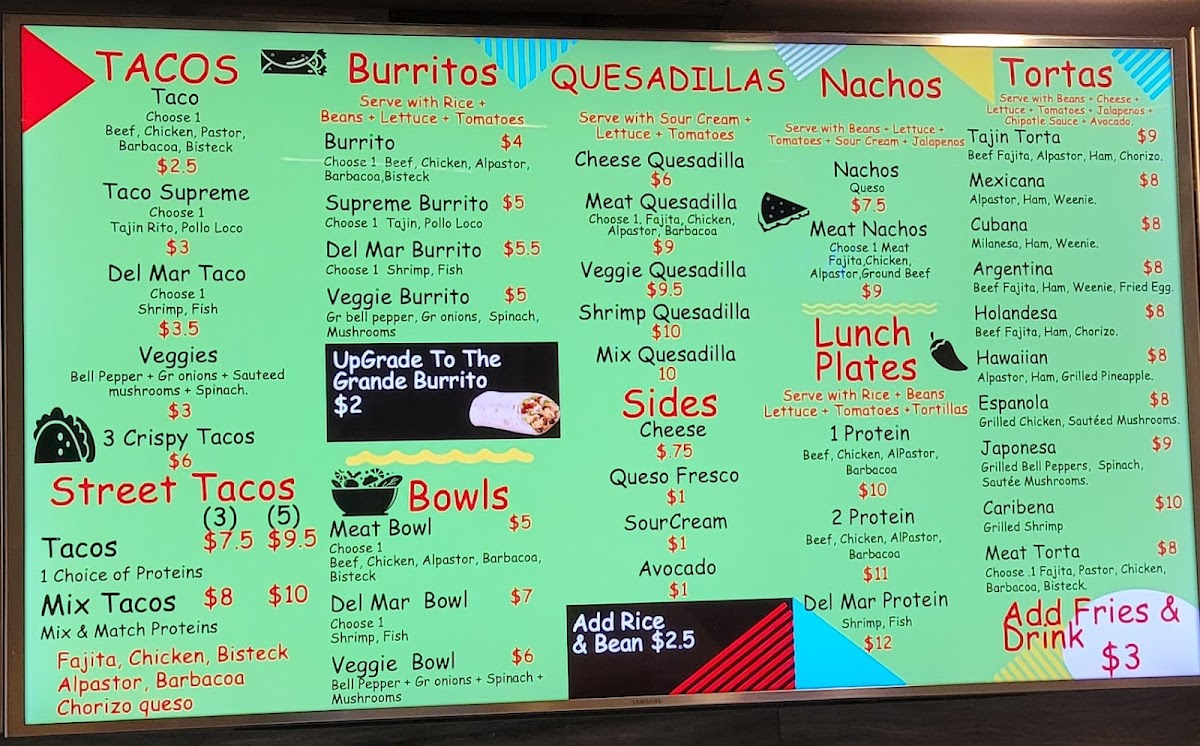 Gourmet Mexican telera with a pinto bean spread, lettuce, tomatoes, avocado, jalapeños, and our chipotle sauce. Served with grilled steak, ham, hot dog, fried egg, and cheese.